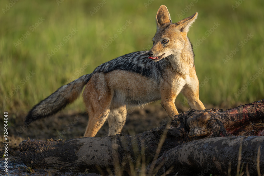 Obraz na plátně Black-backed jackal stands on carcase licking lips