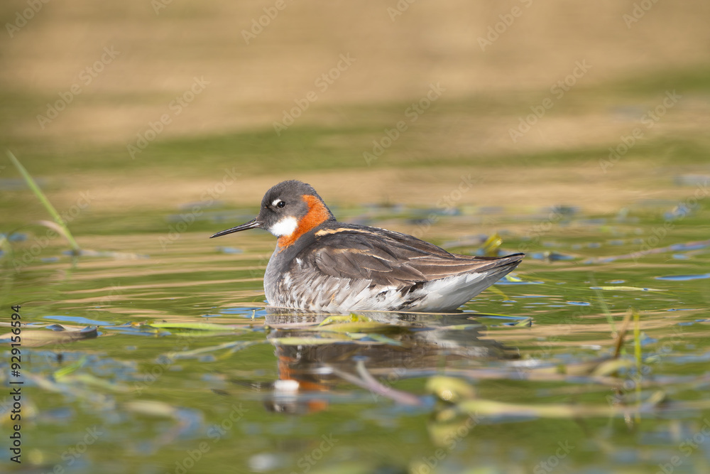 Obraz na plátně Red-necked phalarope, northern phalarope, hyperborean phalarope - Phalaropus lobatus in breeding plumage swimming in water at green background