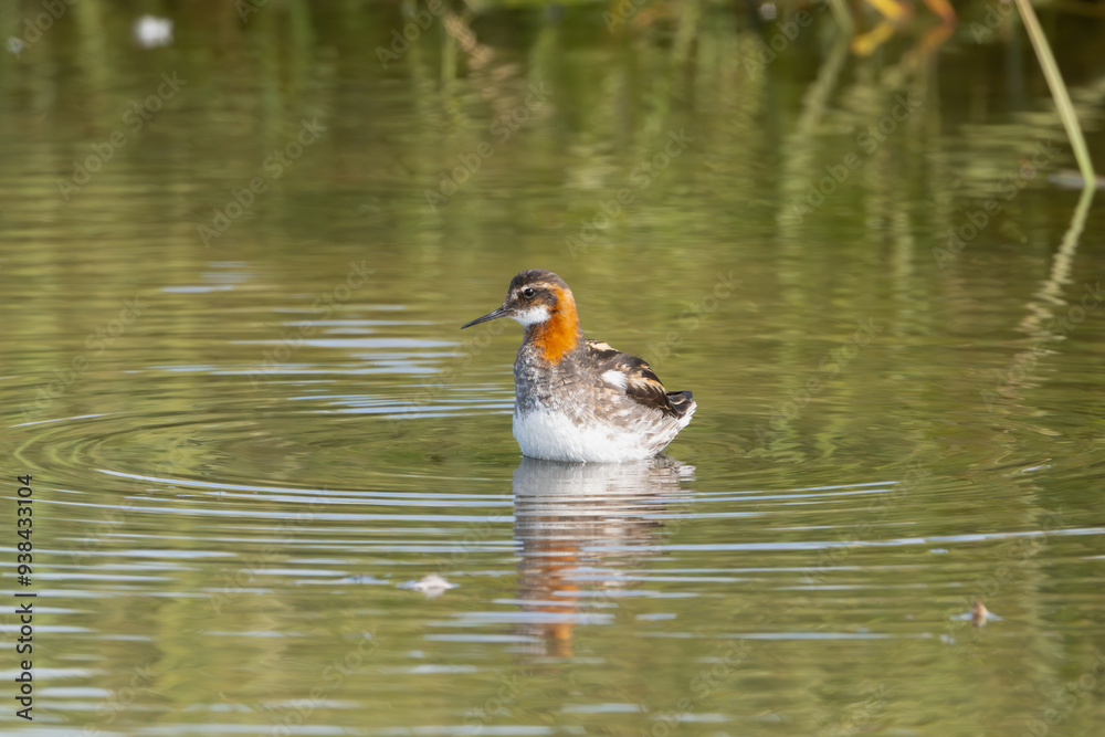 Obraz na plátně Red-necked phalarope, northern phalarope, hyperborean phalarope - Phalaropus lobatus in breeding plumage swimming in water at green background