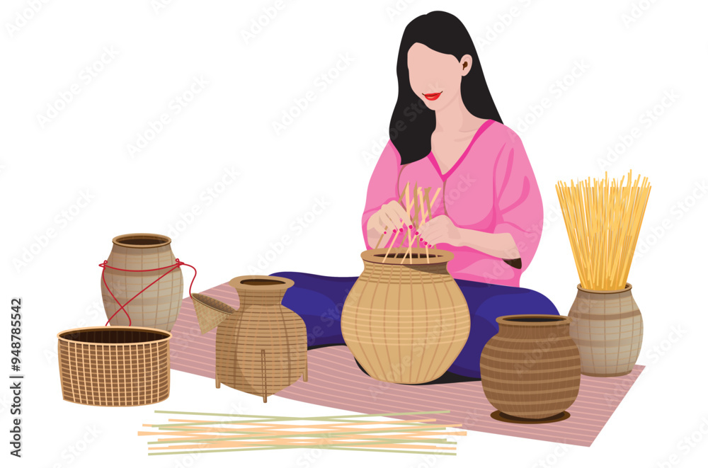 Obraz na plátně country woman is sitting and weaving a container with bamboo