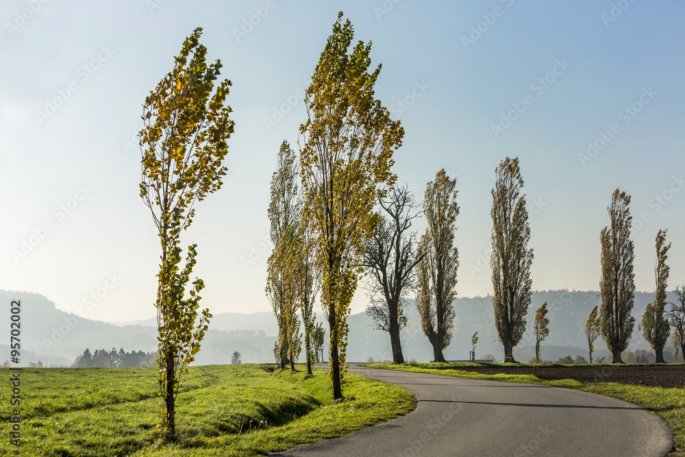 Obraz na plátně Avenue of poplars by rocky massif Lilienstein