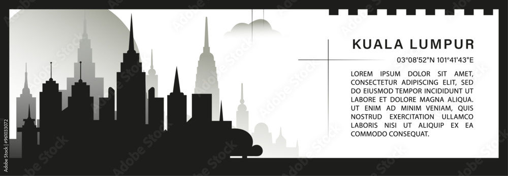 Obraz na plátně Kuala Lumpur skyline vector banner infographic, black and white minimalistic cityscape silhouette