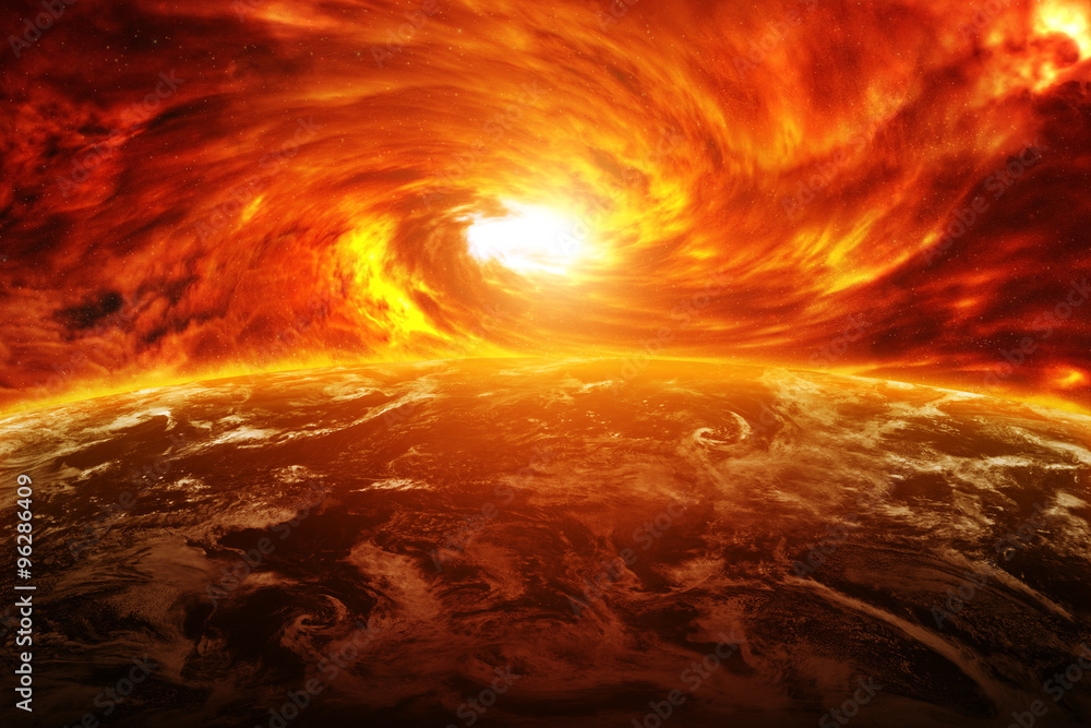 Obraz na plátně Red nebula in space with planet Earth