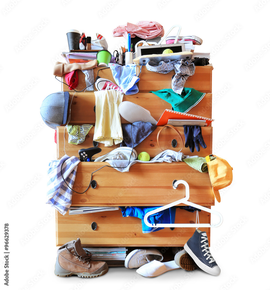Obraz na plátně Mess, dresser with scattered clothes, shoes and other things