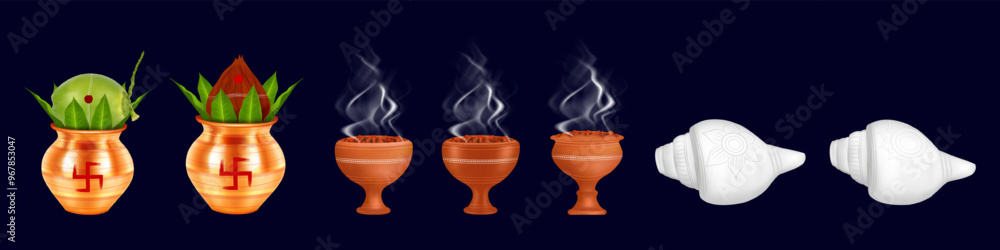 Obraz na plátně Illustration of Durga Puja elements including Kalash, incense burner with smoke,