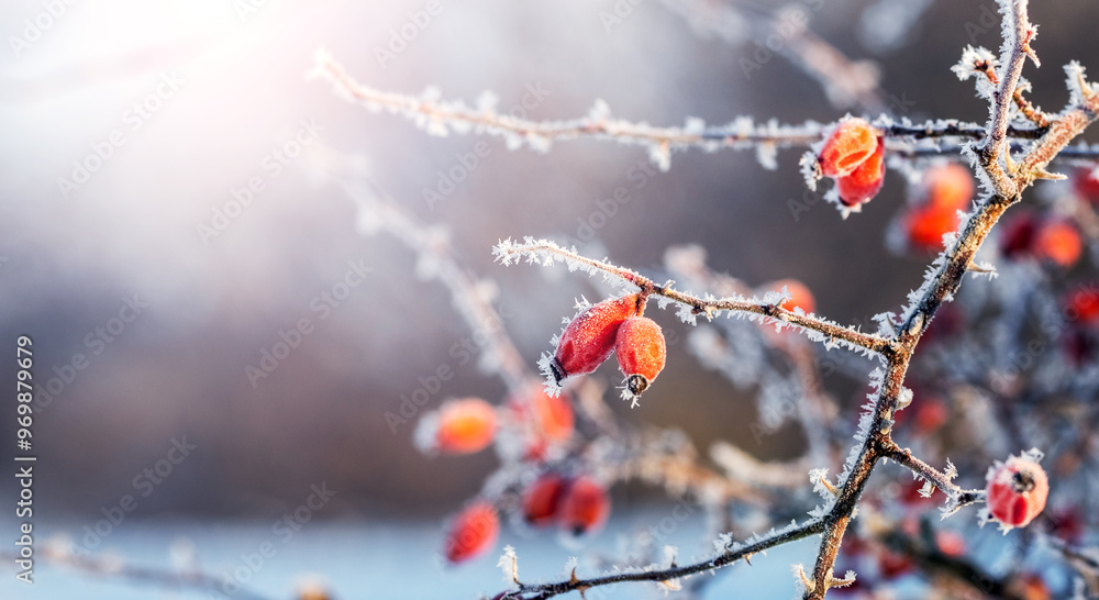 Obraz na plátně frost-covered rosehip bush with red berries in winter in sunny weather
