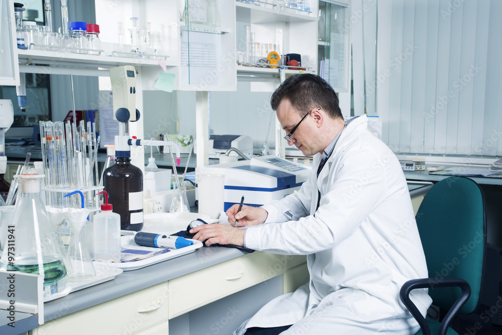 Obraz na plátně Scentist with pencil writing down observations in laboratory