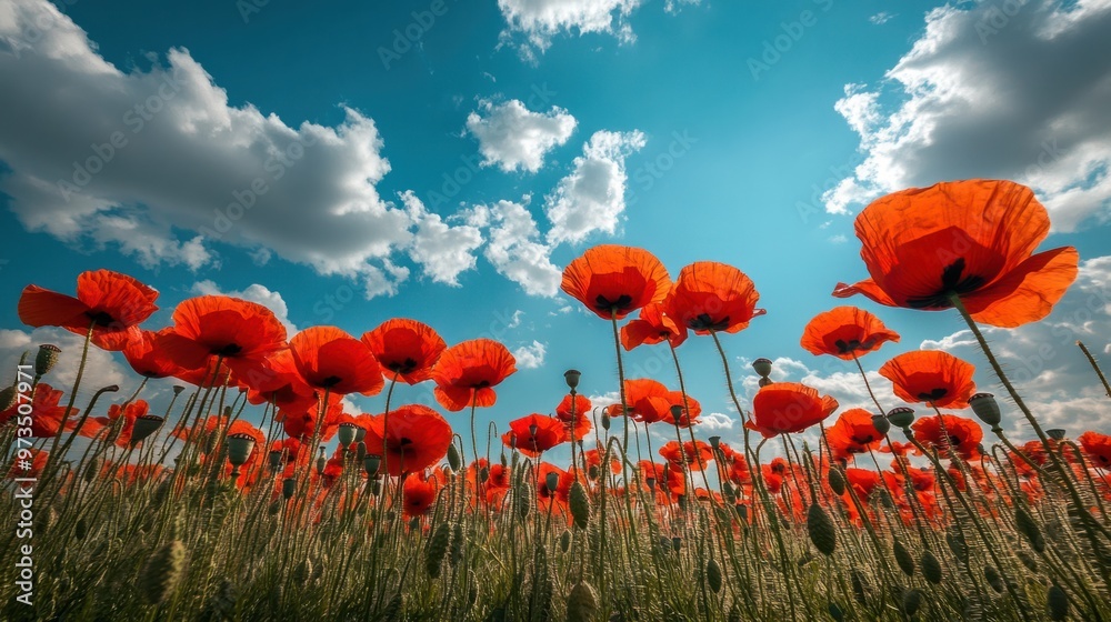 Obraz na plátně A field of red poppies in full bloom under a bright blue sky, with soft clouds d
