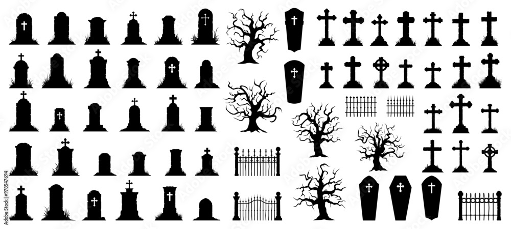 Obraz na plátně Cemetery tombstones with crosses, graveyards and headstones, vector fence and trees