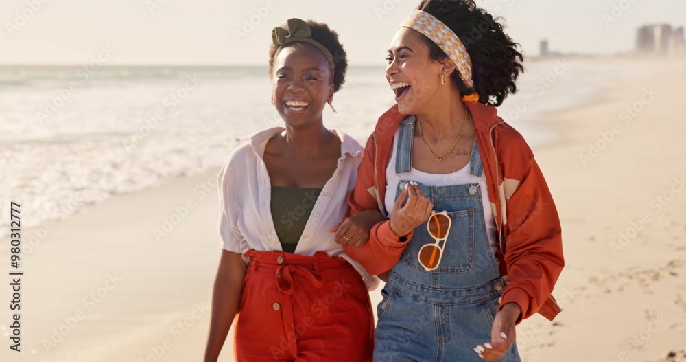 Obraz na plátně Friends, beach and laughing together on sand, outdoor freedom and weekend trip to ocean waves