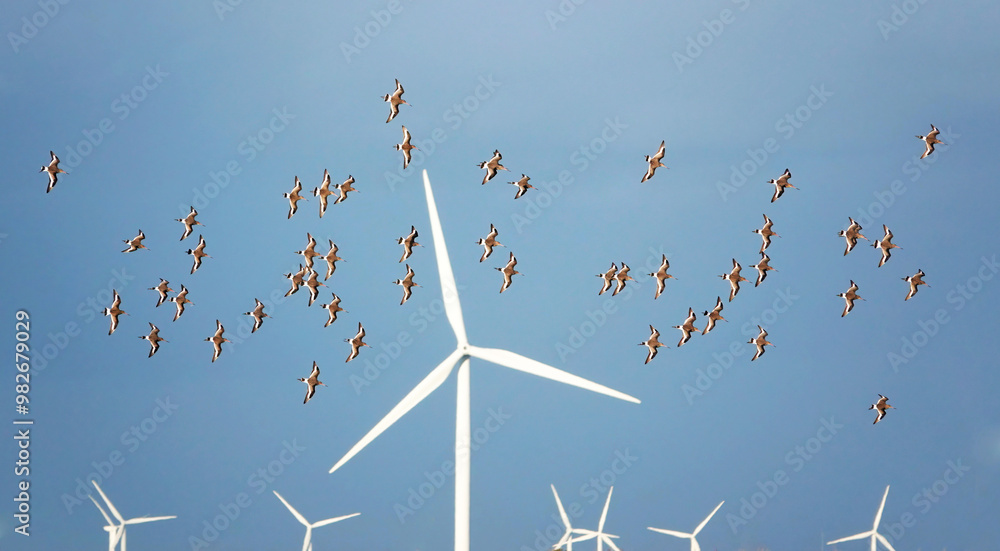 Obraz na plátně A flock of black-tailed godwits, limosa limosa, in flight across a blue sky with modern wind turbines producing green energy posing a danger to wildlife in the background