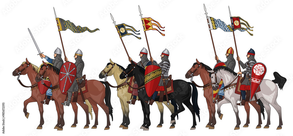 Obraz na plátně Group of Historically Accurate Early Medieval Knights on Horseback in Armour and
