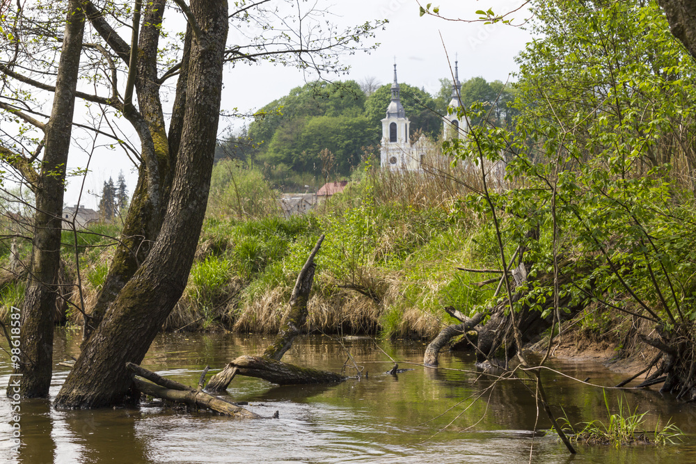 Obraz na plátně Church in the Baltow seen from the river Kamienna, Poland