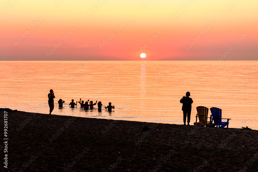 Obraz na plátně dawn dippers: people in silhouette taking a cold water plunge on a beach with t