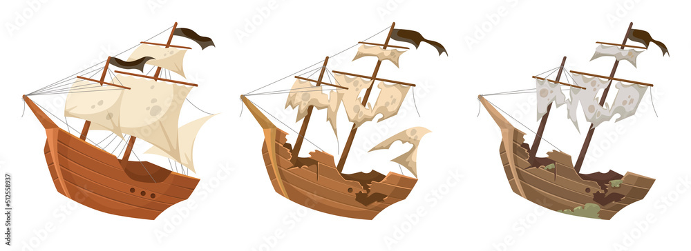 Fotografie Old and new wooden pirate ships vector illustrations set