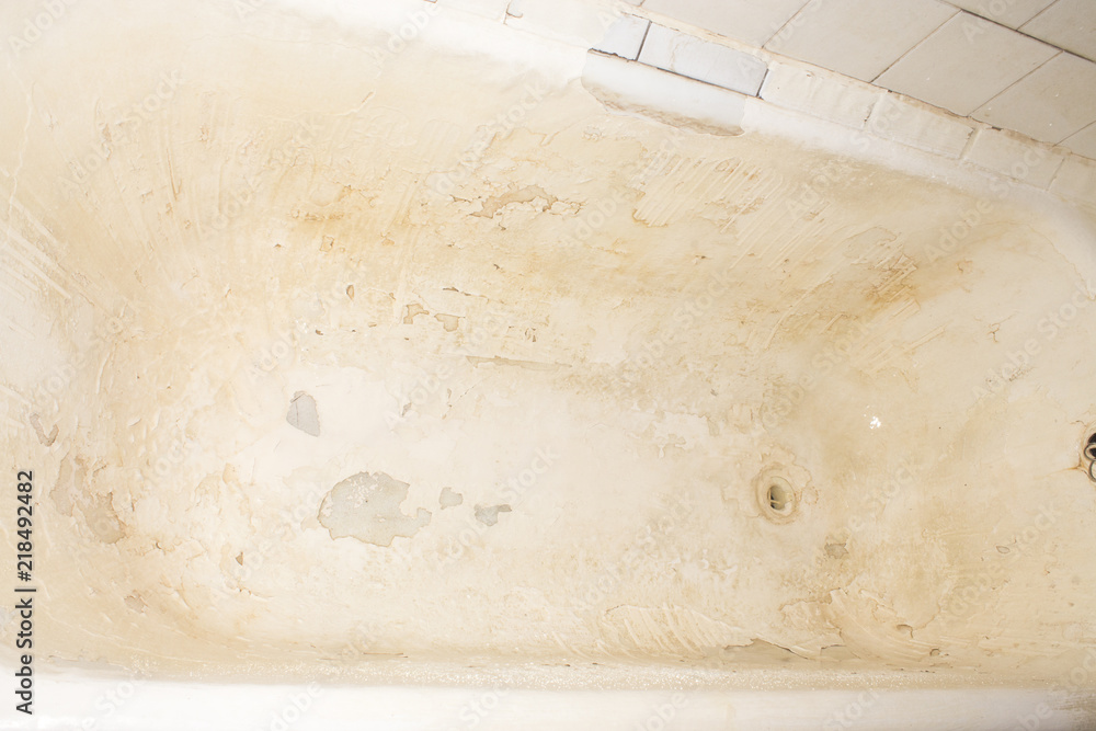 Fotografie Old cracked cast iron tub.Damaged bath cover.