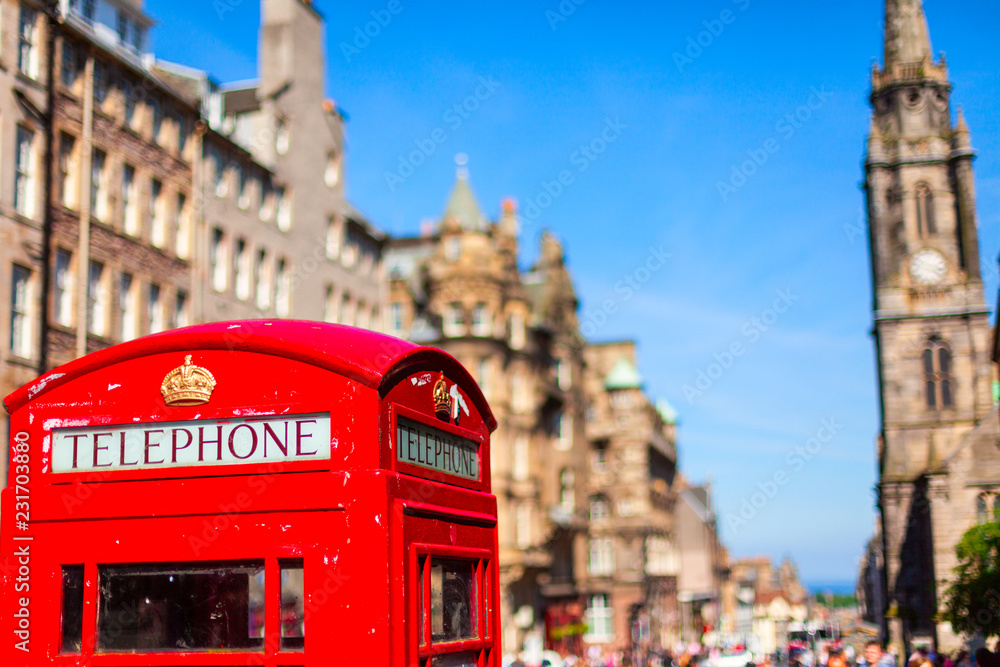 Fotografie Old red telephone booths Royal mile street in Edinburgh