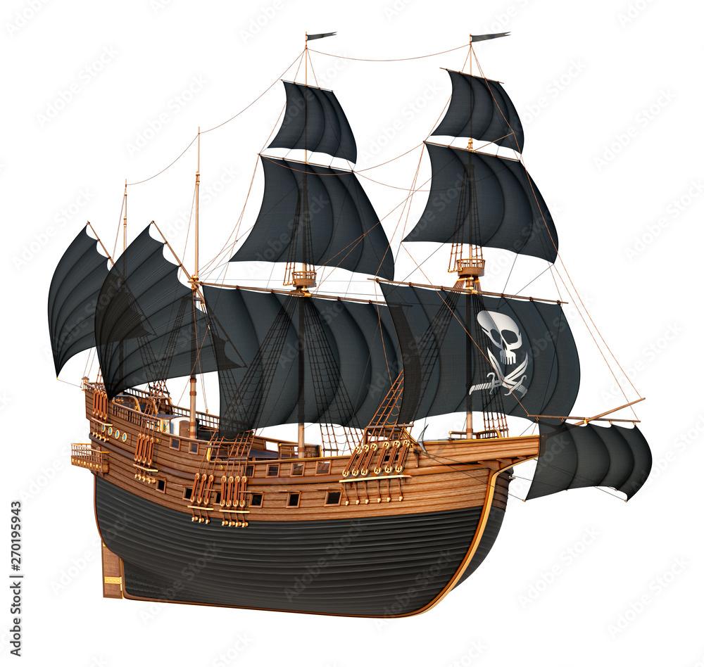 Obraz na plátně Old sailing pirate ship with black sails and a skull with daggers