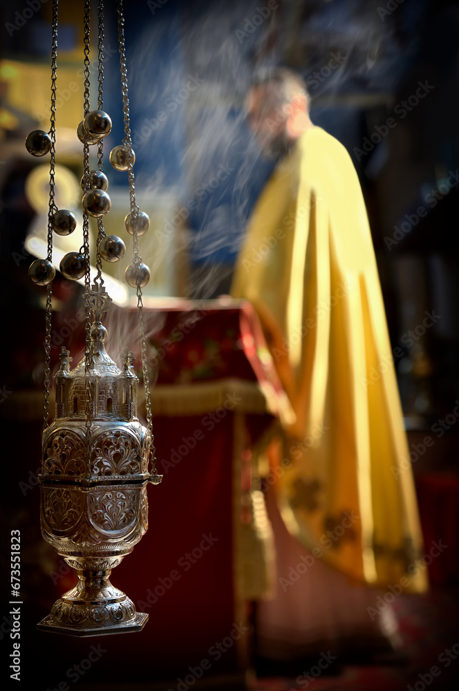 Fotografie Old silver triple chain censer with burning charcoal inside, cloud of smoke, priest in background out of focus (selective focus) during Orthodox liturgy, copy space, vertical