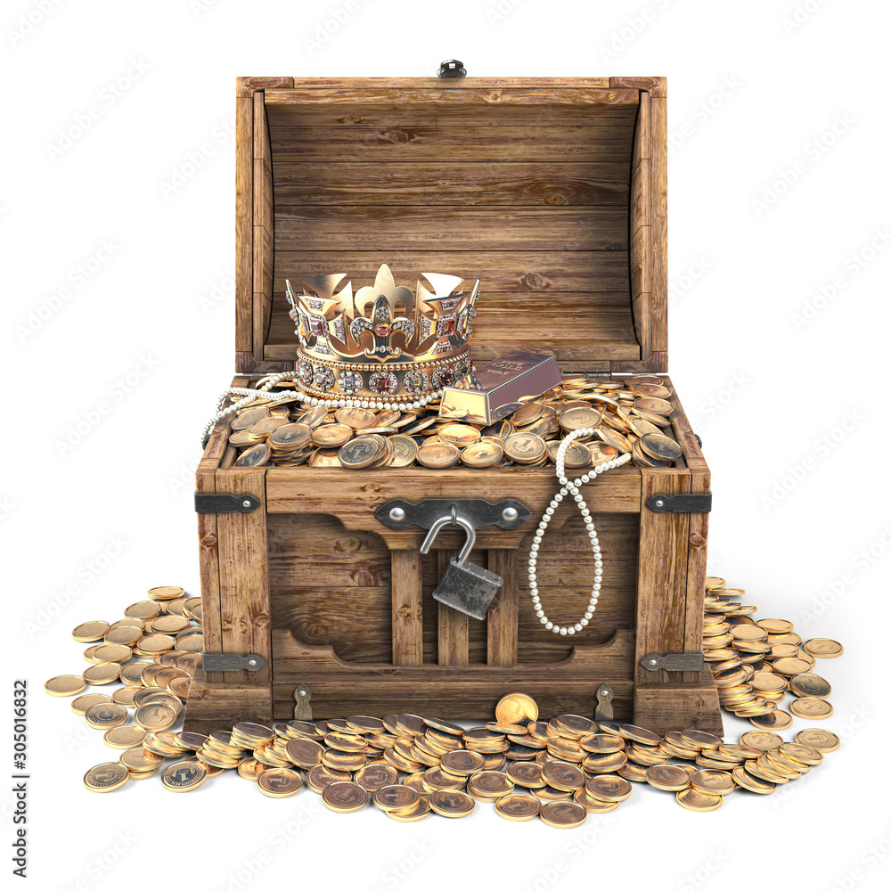Fotografie Open treasure chest filled with golden coins, gold and jewelry isolated on white background