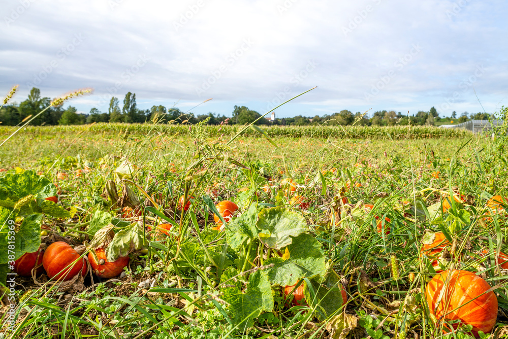 Fotografie Orange pumpkins in a natural field in Switzerland