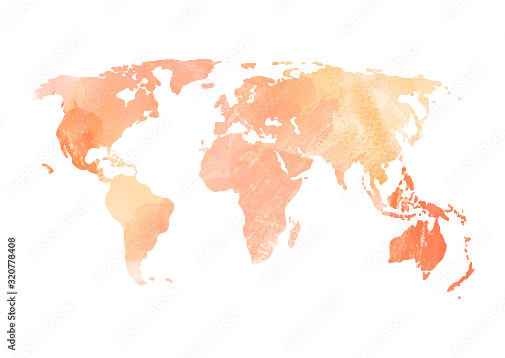 Obraz na plátně Orange World map illustration Watercolor stains texture