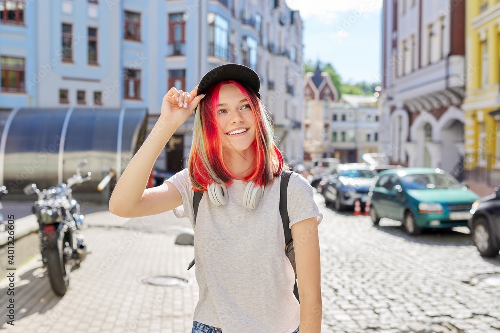Fotografie Outdoor portrait of smiling fashionable teenage girl in black cap