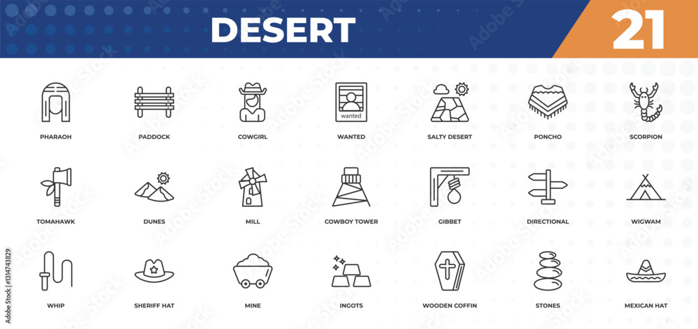 Fotografie outline icons set - desert concept. pharaoh, paddock and more.