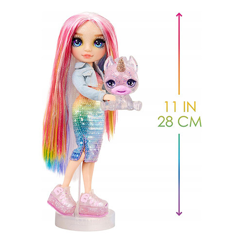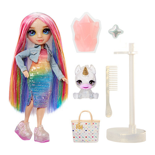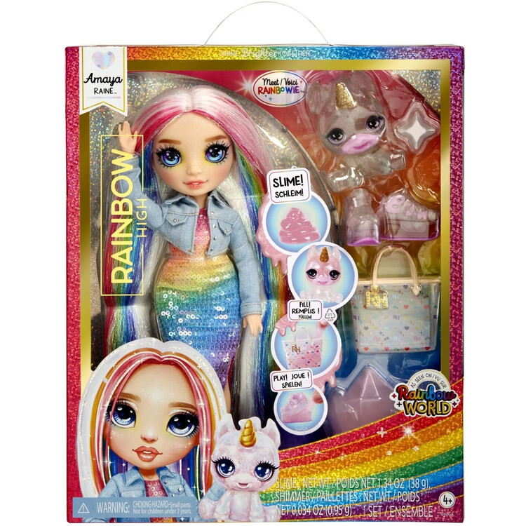 Interaktivní panenka Rainbow High Amaya Raine má u sebe své módní doplňky a magické zvířátko, jednorožce. Panenka měří 28 cm.