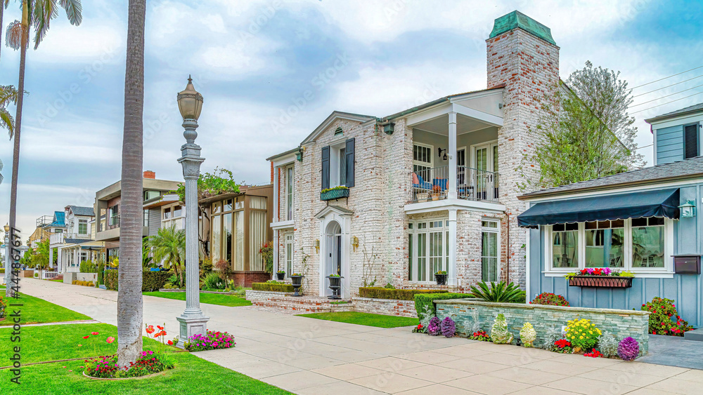 Fotografie Pano Elegant two storey houses and tall palm trees in scenic Long Beach Californ