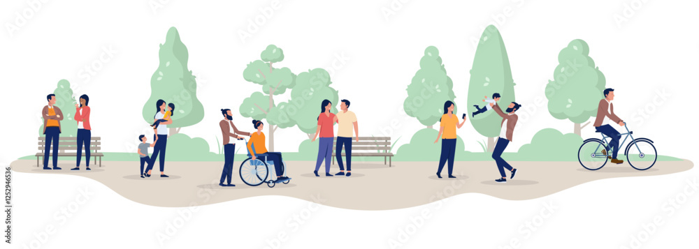 Fotografie Park activities people - Group of pedestrians outdoors walking and spending recreational time in the municipal local park at a day off or weekend