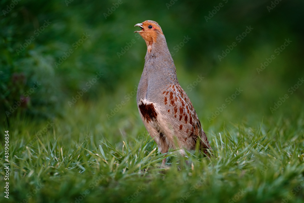 Fotografie Partridge with open bill in the green grass