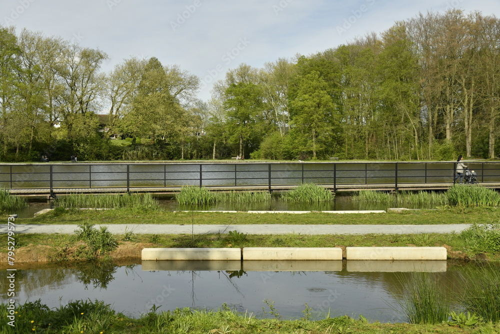 Obraz na plátně Passerelle au raz de l'eau séparant l'étang principal et la partie biologique au