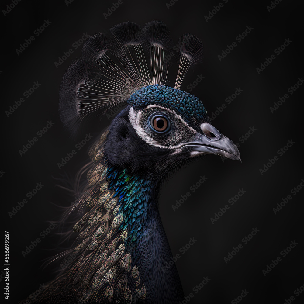 Obraz na plátně Peacock Portrait Black Background-Generative AI