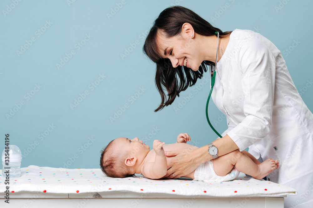 Fotografie pediatrician brunette in a white robe examines the baby