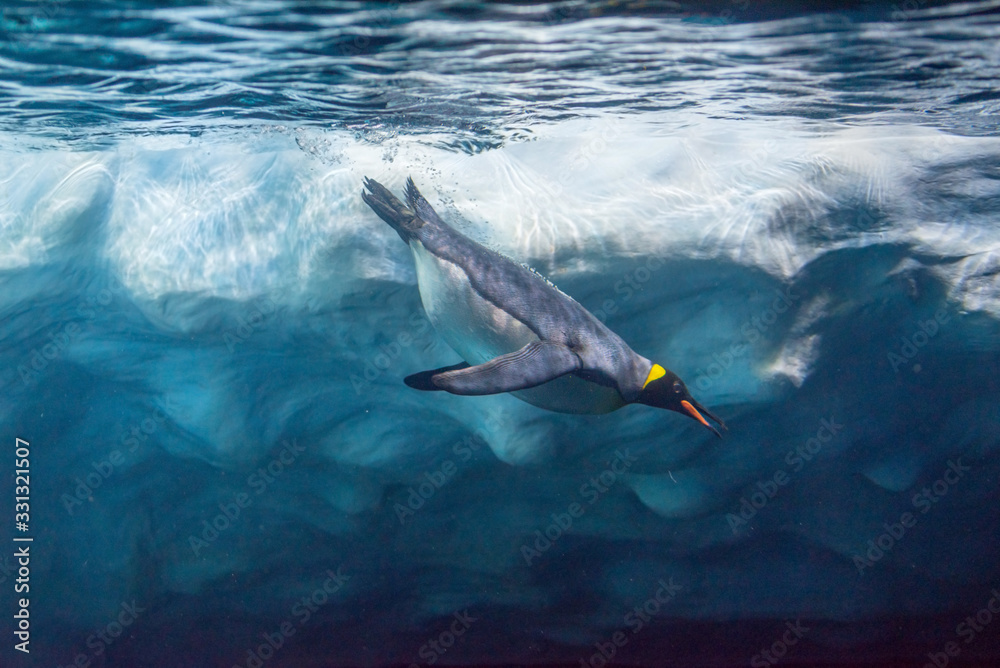 Obraz na plátně Penguin diving under ice, underwater photography .