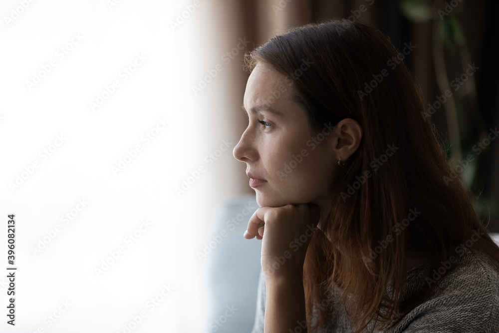 Fotografie Pensive young woman looking in distance at window, thinking or life problems, suffering from loneliness or depressive mood, regretting mistakes, having psychological mental problems, copy space