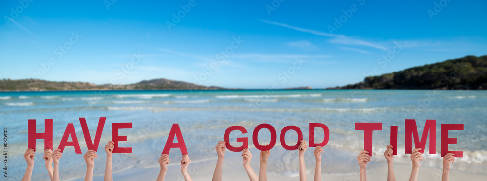 Fotografie People Hands Building Word Have A Good Time, Ocean And Sea