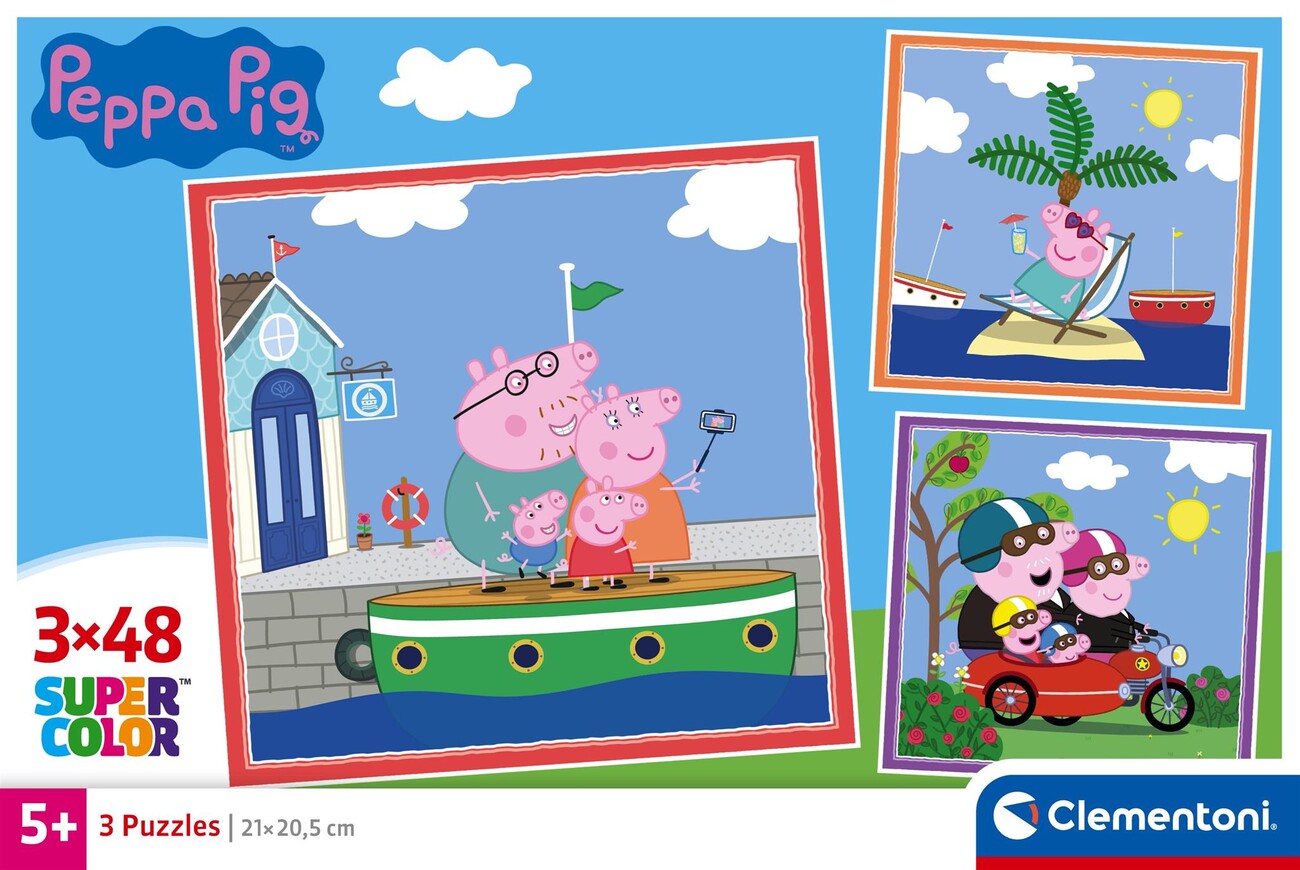 Sada 3 puzzle Prasátko Peppa (3×48 dílků). Veselé motivy z oblíbeného seriálu vtáhnou do skládání. Dílky se dobře drží a hladce do sebe zapadají, děti si tak přirozeně trénují jemnou motoriku i soustředění. Puzzle Clementoni vynikají ostrostí tisku a přesným výsekem, takže skládání jde skoro samo. Baleno v robustní, elegantní krabici.
