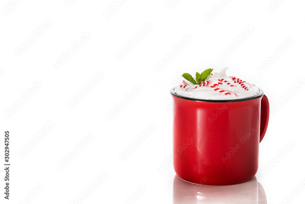 Fotografie Peppermint coffee mocha decorated with candy canes for Christmas isolated on white background