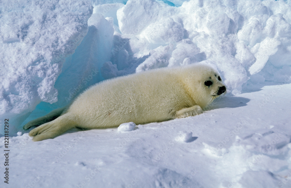 Fotografie Phoque du Groenland, jeune, Pagophilus groenlandicus, Banquise, Ile de la Madele