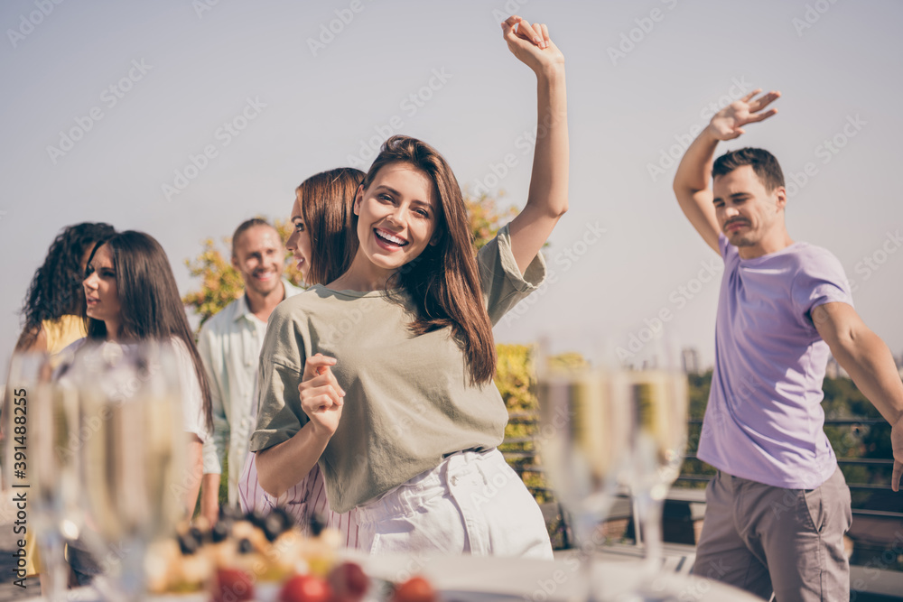 Obraz na plátně Photo of cool pretty girls guys have fun dancing meals drinks on table party on