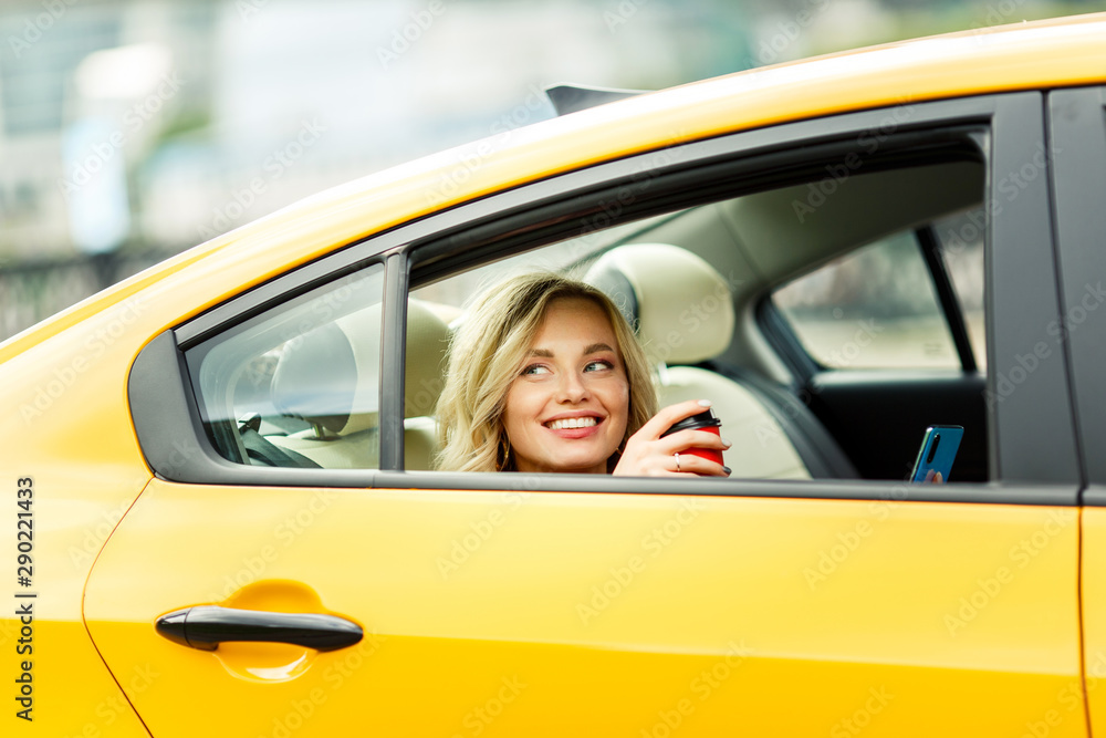 Fotografie Photo of young woman with coffee in hands sitting in back seat of yellow taxi in