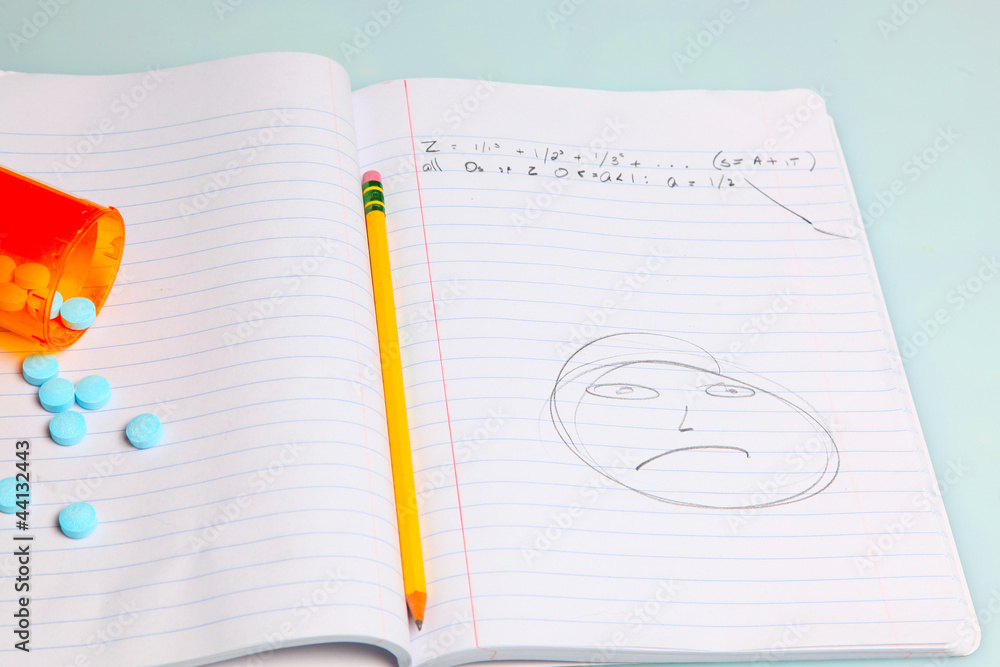 Fotografie Pills & pencil against composition book