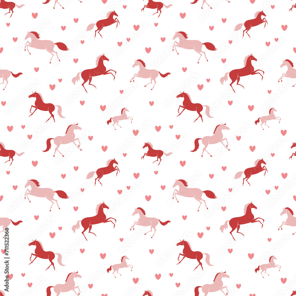 Fotografie Pink ponies and hearts on a white background, seamless vector pattern