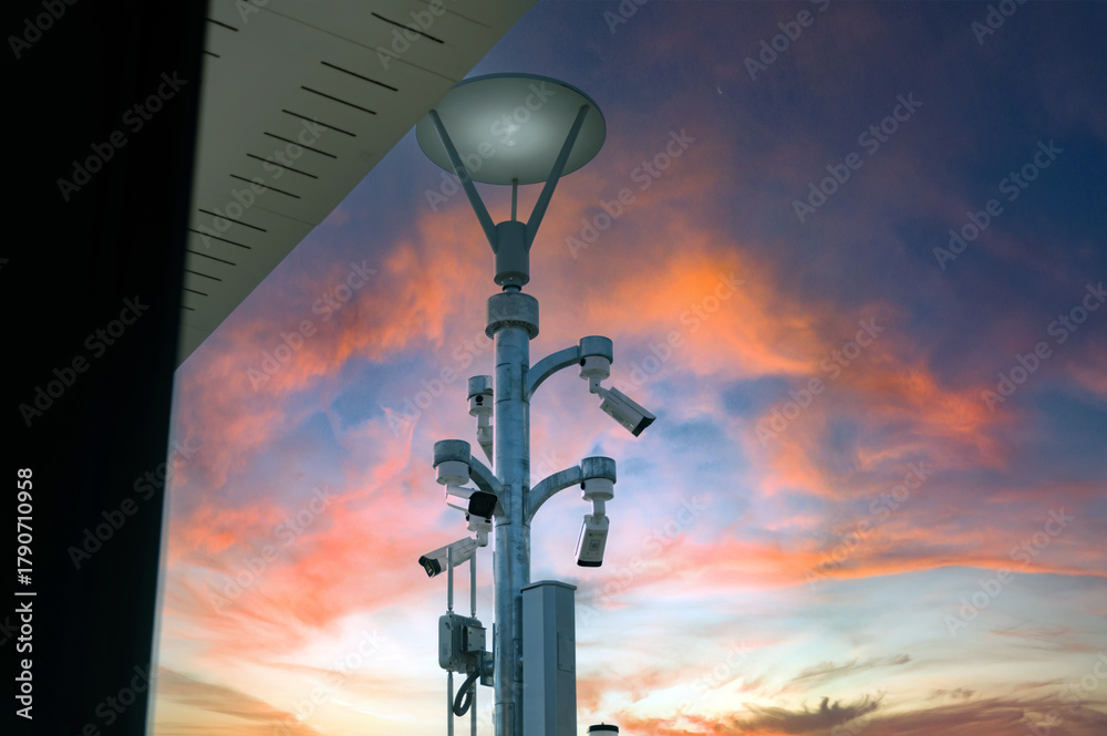 Fotografie Pixed ip cctv cameras installed on outdoor high metal post of the buildings to do security by monitoring on mobile phone and computer to save human life and property by cctv cameras instead of human