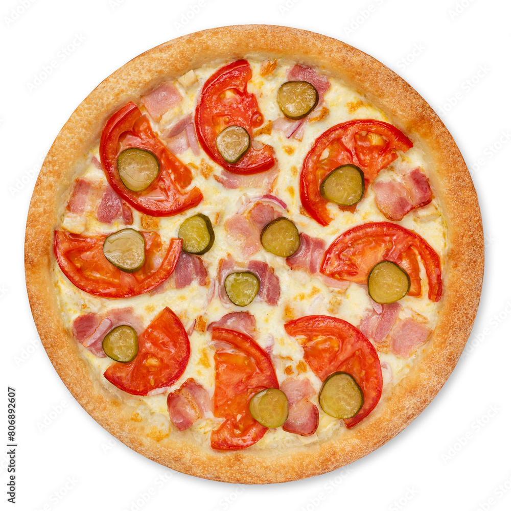 Fotografie Pizza with bacon, tomatoes and cucumbers, top view, on a white background, isolation