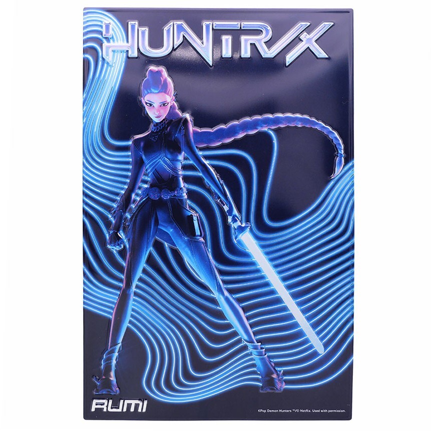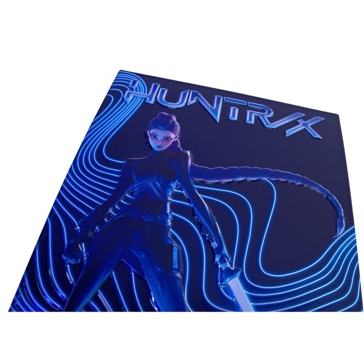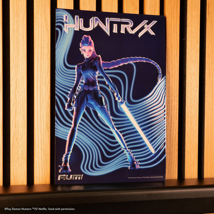 Embosovaná hliníková tabulka pro fanoušky Rumi, zpěvačky Huntrix s elektrizující energií. Texturovaný, vystouplý reliéf chytá světlo a dodává obrazu hloubku i výrazný 3D efekt. Oficiálně licencovaný produkt.