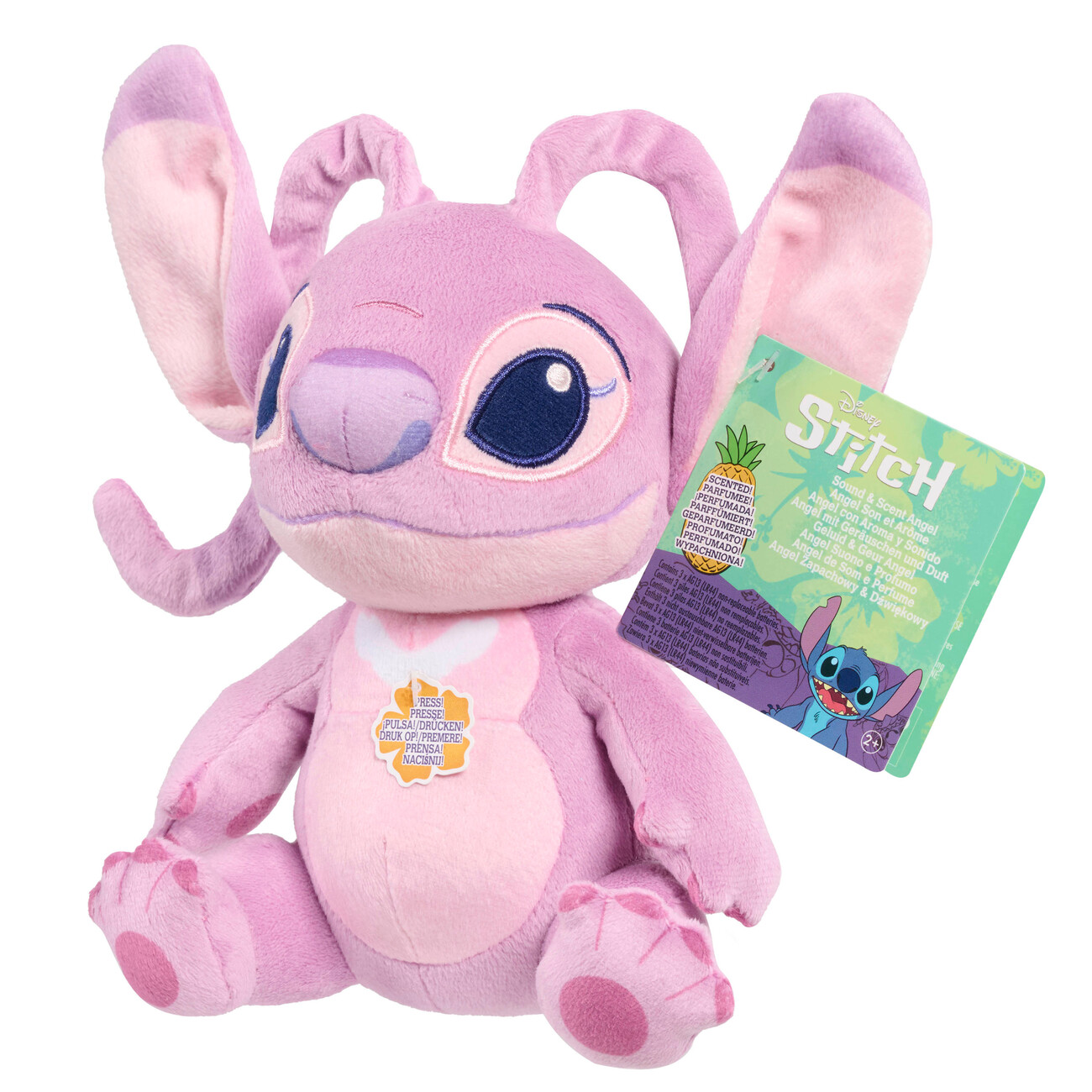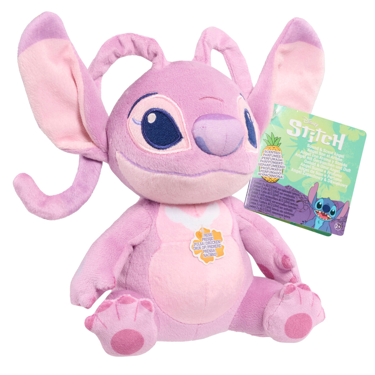 Roztomilý interaktivní plyšák Angel potěší malé i velké fanoušky Disneyho. Vyrobený z jemného, sametově měkkého materiálu a naplněný kuličkami s příjemnou vůní ananasu je ideální na mazlení i hraní. Po stisknutí bříška plyšák vydává typické zvuky, které dětem vykouzlí úsměv na tváři. Díky své velikosti 15 cm se snadno vejde do batůžku i do postýlky. Vhodný pro děti od 2 let.