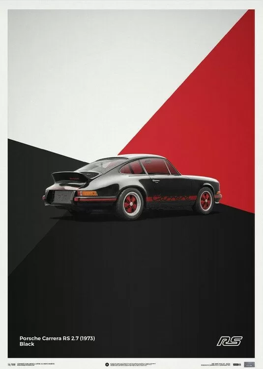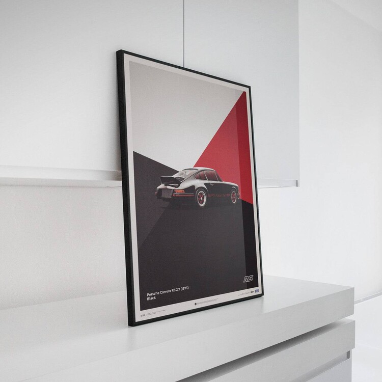 This Porsche 911 Carrera RS poster features one of the most classic 911s ever built in black. Designed to meet motorsport requirements, the RS – meaning Rennsport, the German word for race sport – featured a larger engine than the standard 911 S, stiffened suspension, and an iconic ‘ducktail’ rear spoiler. In total, 1,580 were made between 1973 and 1974, all of which qualified for the FIA Group 4 class. Our posters have been created to complement the wide selection of iconic and eye-catching colors the cars were painted in – printed on perfectly weighted paper, as part of a production run of just 911 prints. For all of our posters we use high quality off-set printing, premium paper, and vibrant color reproduction that stands the test of time – just like the cars themselves. Each one is limited and labeled with a special hologram sticker to denote its authenticity.